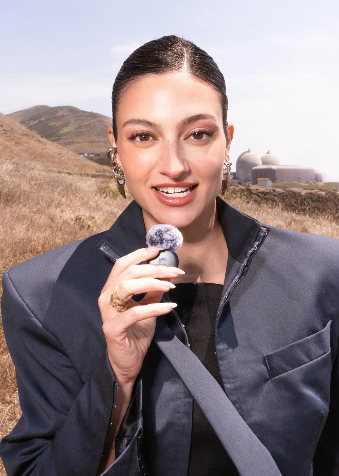 Una mujer lucía un traje negro con una chaqueta azul oscuro en un descampado, al fondo puede verse una central nuclear.
